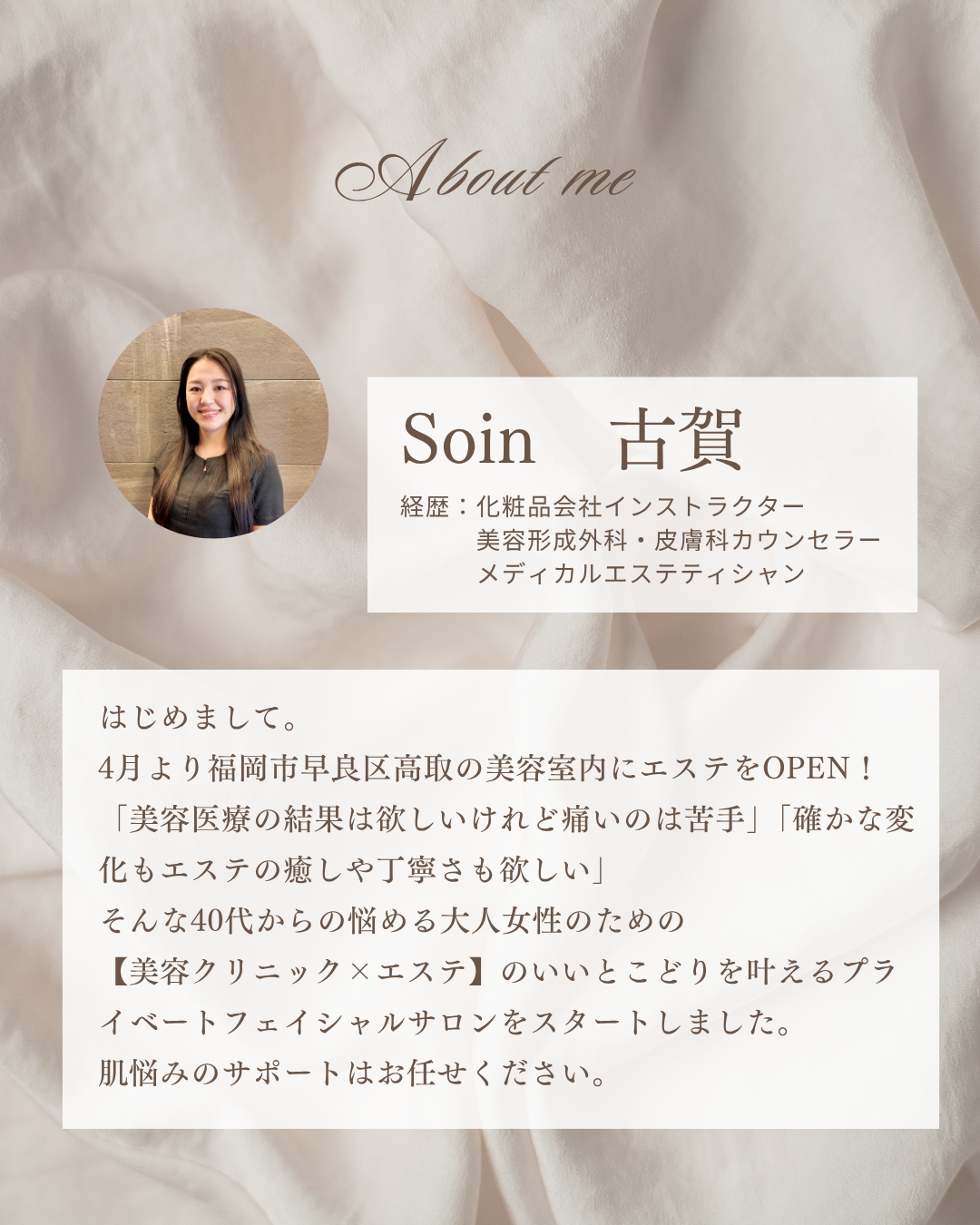 4月より福岡市早良区高取の美容室内に エステサロンをオープンいしました、古賀です。
